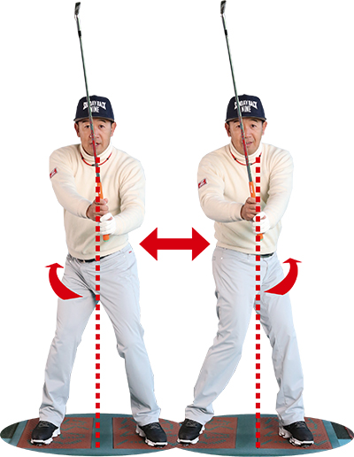 100が切れない人は、たくさん球を打って「クラブを使って球を打つ」という感覚を体に覚えさせましょう。しかし、常に80台で回りたいという人は、一度に200球も300球も打つ必要はありません。打つ球数は少なくてもいいので、下半身(土台)をしっかりさせ、“体を回すのではなく、上半身を入れ替える”という体の動きを確認しましょう。これが第二の法則です。