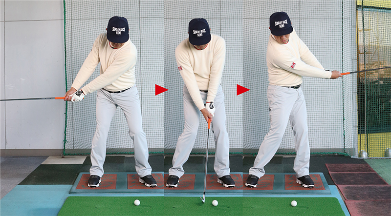 体と腕の振りがバラバラだと真っすぐ球が飛びません。このハーフスイングで真っすぐ飛ばせるようになったらOK。