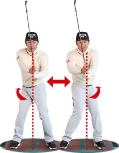 上半身を入れ替える動きを手に入れたら、そこから体と腕が離れないようにして、体の動きと腕の振りが一体化するようにクラブを振ることを覚えましょう。それを体得するには「9番アイアンのハーフスイング」が効果的です。