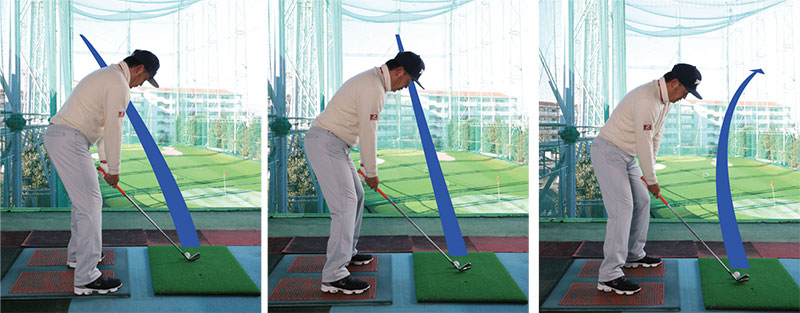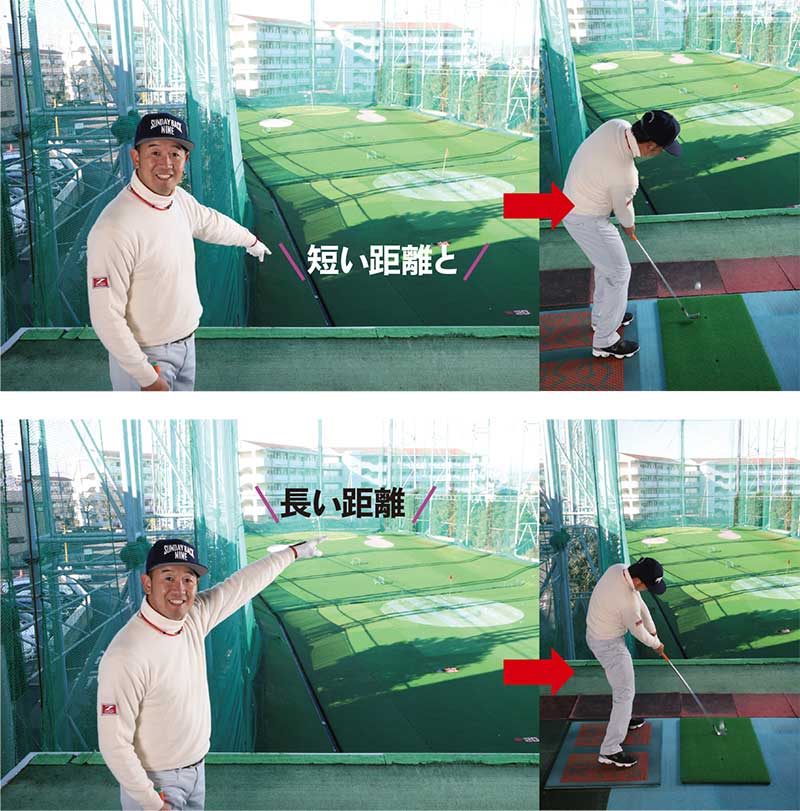 ①30ヤード地点と90ヤード地点というように、球を落とす地点を変えて打つ。