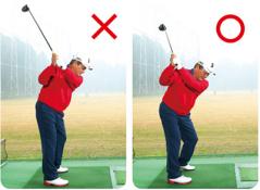 前者は左腕を伸ばしたままテークバックし、なるべく長くヘッドを低く保つことでできます。これで左肩がその人なりに回り、深いバックスイングができます。