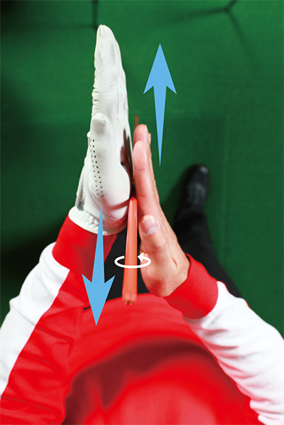 竹とんぼを飛ばすときは両手を前後に動かして軸を回転させる。この要領でスイング中に足裏で地面を踏むポイントを前後に移動させる。