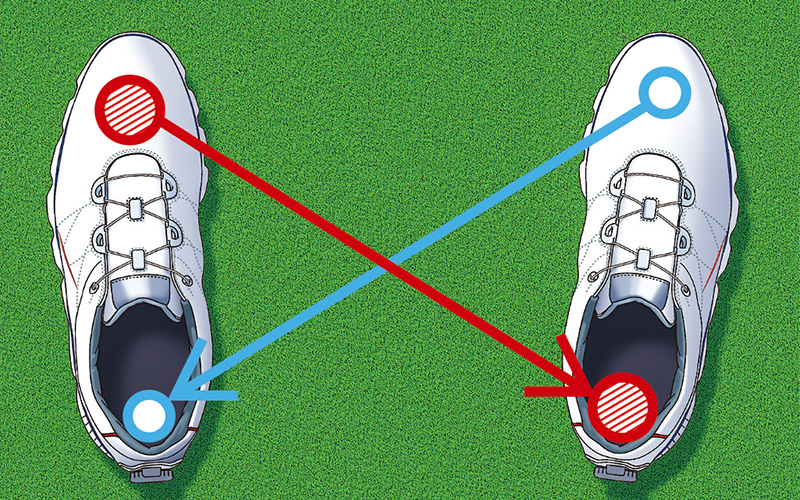 バックスイングでは左足ツマ先から右足カカトへ、ダウスイング~フォローでは右足ツマ先から左足カカトで地面を踏みつけながら動く。
