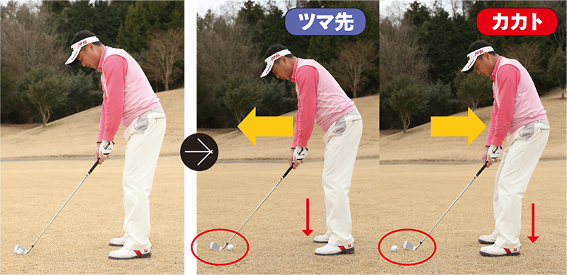 ボールの近くに立ちすぎていて、アドレス時の重心がカカト寄りにある証拠。