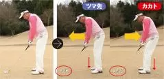スタンス幅を狭めにアドレスしたら“手を動かさず”に体重をツマ先とカカトにそれぞれかけてかけてみよう。