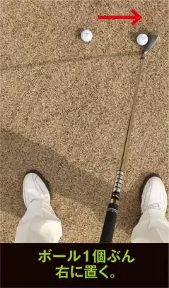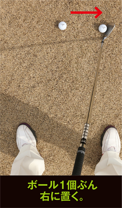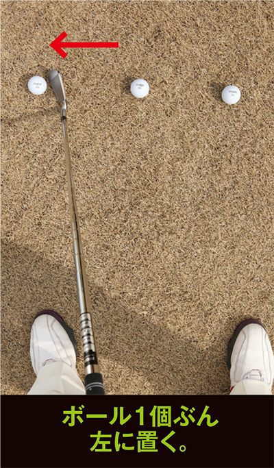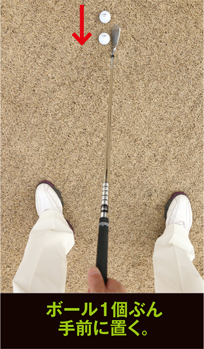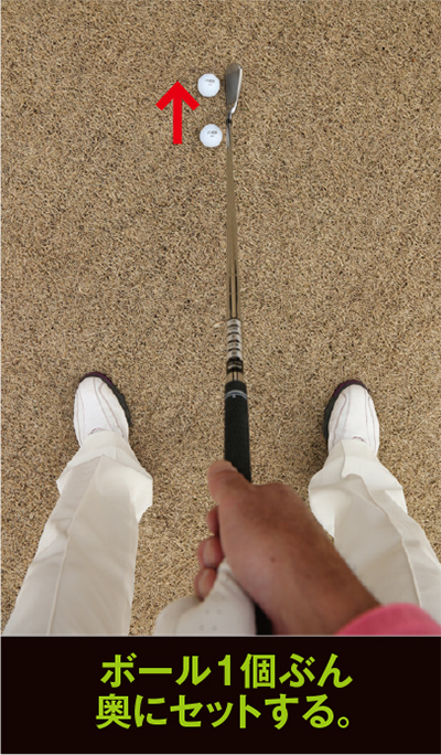 ボールの一個分左にヘッドを置いていつもどおり構えます。そこからヘッドだけをボールにセットし直して球を右足寄りにします。いつもよりハンドファーストになる感じがつかめたらOKです。