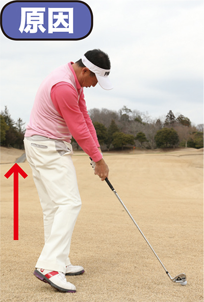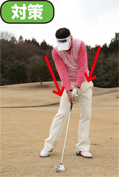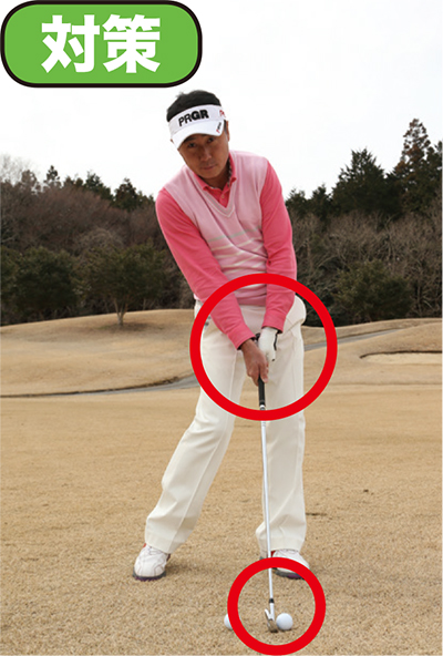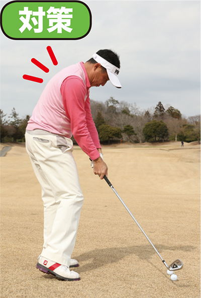 通常のアドレスをとってから、カカト体重で少し体を起こしてヘッド位置を体に近づけるようにしてみましょう。そこにボールがくるように構えればOKです。たとえ伸び上がるクセがあっても最初から体を起こしておけばクリーンに打ちやすくなります。