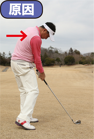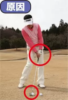 (原因)ボールを打ちにいって右肩が出てフェースがかぶる。