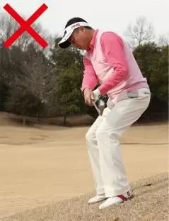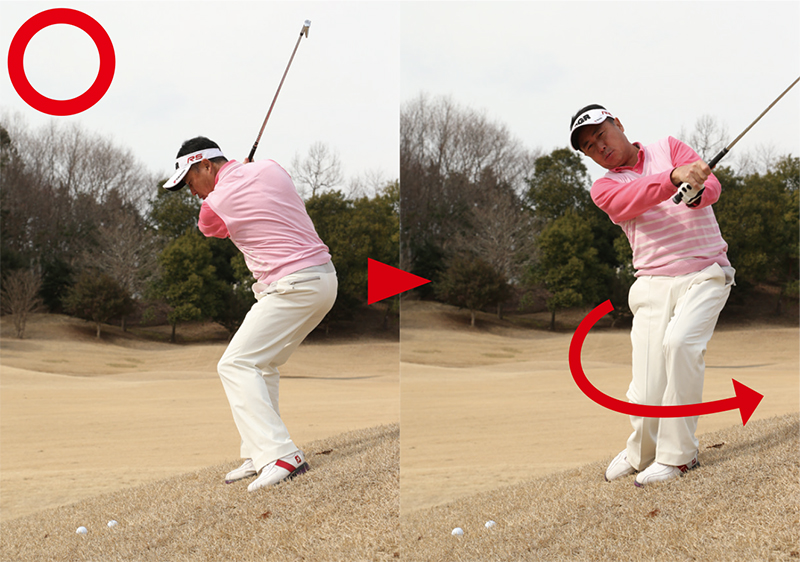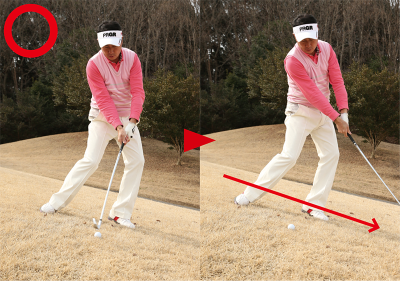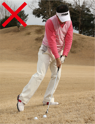 傾斜地ではまずインパクトの形を作り、逆算してボール位置を決めよう!