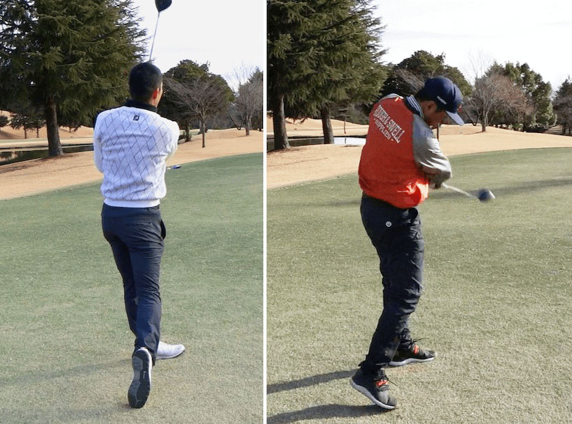 左:佐藤順(ハンデ+1のトップアマ。ヘッドスピード47。ほぼストレートで軽く右に曲がるフェードヒッター。ドライバー飛距離は270ヤード前後)