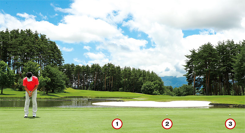 ちょっと余裕があれば、ショートパットをモノにする「東西南北打ちドリル」に加えて、チェックしやすい3種類の振り幅で、どのくらい転がるかを確認して、距離感をつかもう。