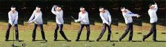 バックスイングは通常と同じイメージだが、クラブを短く持つため、トップが自然にコンパクトになる。フィニッシュは低い位置に止めよう。