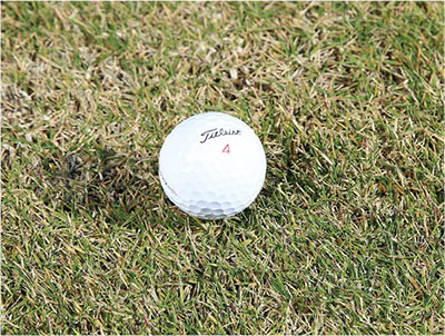 グリーン手前の花道は一般的にはボールを打ちやすい「良好なライ」といえますが、春先でまだ芝が薄い場合はそれが当てはまりません。緑色に見えるのは大部分が着色のためで、実際は芝がかなり薄くなっているケースもあります。サンドウェッジのフェースを開いてボールを高く上げようとするとザックリやトップなどのミスが生じます。
