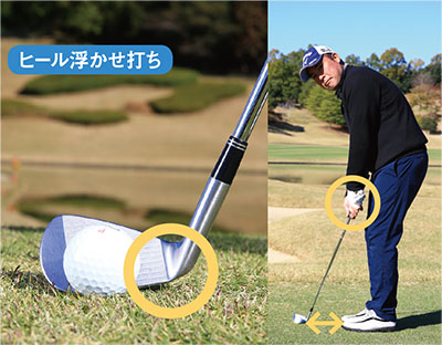 ボールのライを十分に観察し、芝が薄くなっていると判断したら、ピッチングウェッジを使用した〝ヒール浮かせ打ち〞をオススメします。ヒールを芝から離せば、ライが悪くてもボールをクリーンにとらえられます。しかもハンドアップに構えることでリストを固定しやすく、パットの要領で打てるのでとてもシンプルです。