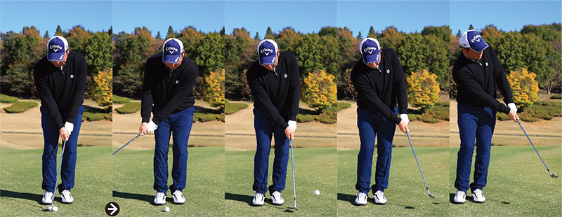 ハンドアップに構えると両手首を固定しやすくなる。あとはパットのストロークと同じようにリストを使わず、小さな肩回転でスイングするだけでOK!