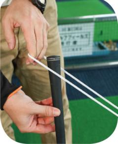 輪っかにして長さを調整したゴム紐をグリップエンドに引っかける。