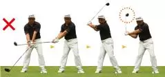 ドラコンスイングはカラダの回転スピードも手の振りも速いため、トゥから上げるとフェースを戻し切れず、開いたままインパクトを迎えてしまう。