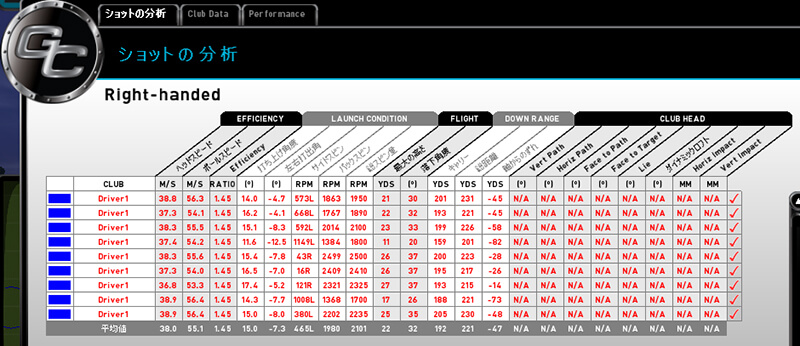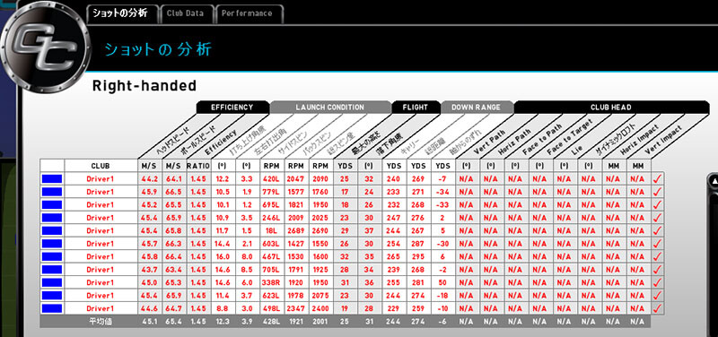 平均ヘッドスピードが45.1m/s と、かなり⾟⼝のGC2でも素晴らしい結果。 ドライバーのトータル⾶距離でも274ヤードとなかなかの⾶ばし屋だ。