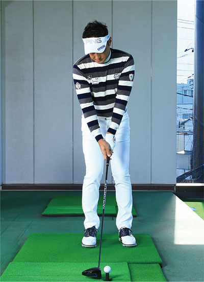 スタンスを小さくして、肩幅よりも狭く構える。ボールの位置は体のセンターに。
