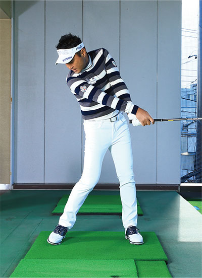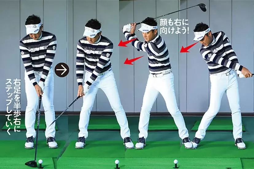 右足を半歩、右へ動かす。その反動を使ってクラブを上げていく。この時、体の回転