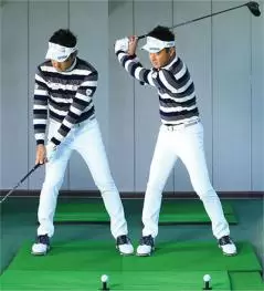 足を肩幅よりも狭く構えて、テークバックする時に、右足を半歩だけスタンスを広げるのです。大切なのは、右足をステップさせる時に、顔も一緒に右に向けること。そうすることで、テークバックのタイミングをつかみやすくなり、体が大きく回るようになります。