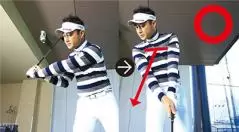 切り返しで顔が先に左を向いてしまうと、体が開き、クラブが外から下りてスライスになる。
