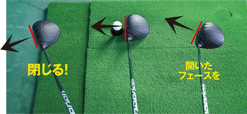 インパクトの前後で、フェースは開いて閉じる動きになる。この動きがあるからこそ、ドローが生まれる。