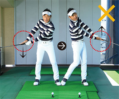右手のヒラが下を向くようにテークバックすると、その反動でフォローではフェースが上を向いてしまう。フェースが開いたままインパクトする原因に。