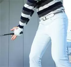 フォローでクラブが左腰の高さまでくると、右手の甲が正面を向く。外側に振り出す動きと連動させる。