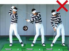 ダウンスイングに入っても、視線は右のタオルに置いたまま。左を向かないようにしてクラブを下ろしていく。