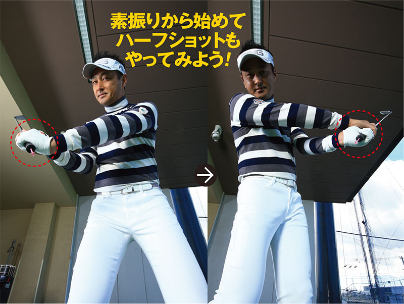 ここがポイント! テークバックやフォローで親指を空に向けよう。