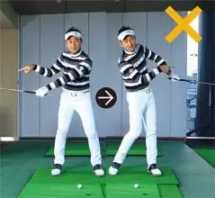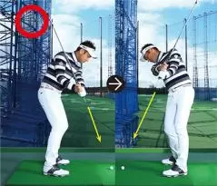 左手親指が立たずに外を向いていると、正しいコックができておらず、軌道は安定しなくなる。