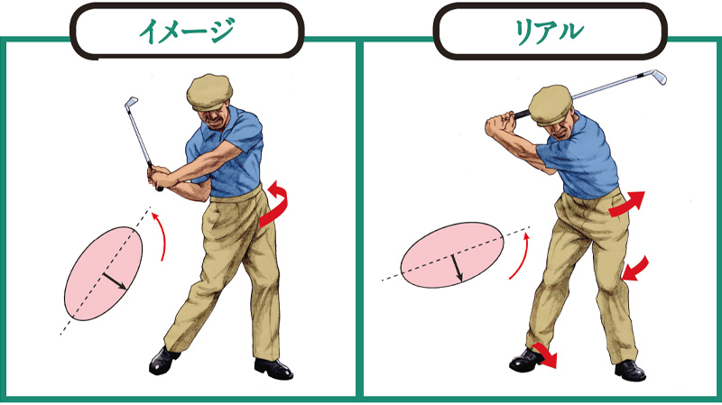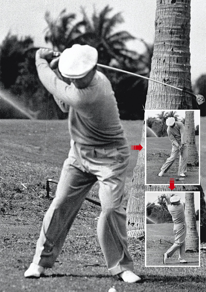 「ダウンで腰のターンを強調すると、体が開いて振り遅れてしまう、いわゆる“スピンアウト”になりそうですが、実際のホーガンのスイングはそうなりません。左ヒザの内向きのテンションが、ダウンでの開きを抑制しているからです」(森)