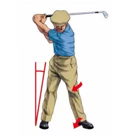 「バックスイングで肩のターンに従って腰のターンを行いますが、アドレスで両ヒザを内向きにしておくことで、その動きが一定になります。ポイントは、右脚のポジションを変えず、左脚を内側に倒していくこと。