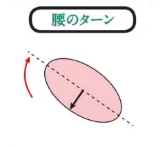 左腰が少し下がることで右腰が切れ上がり、ターンは45度以下に