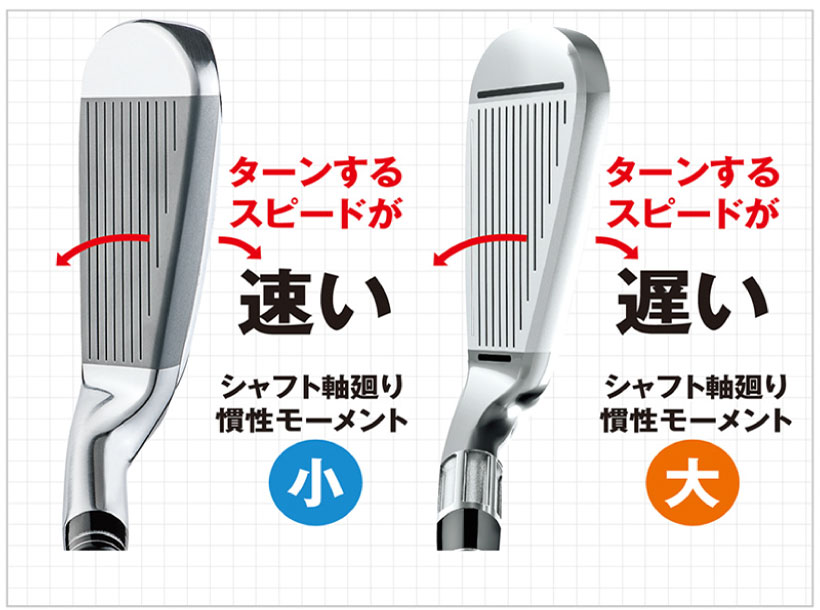 バンスはヘッドの入射角と、シャフト軸廻り慣性モーメントはフェースの開閉度合いと相性がありますから、激飛びアイアンを選ぶ際には、自分の入射角とフェースの開閉に合ったものを選んでください。