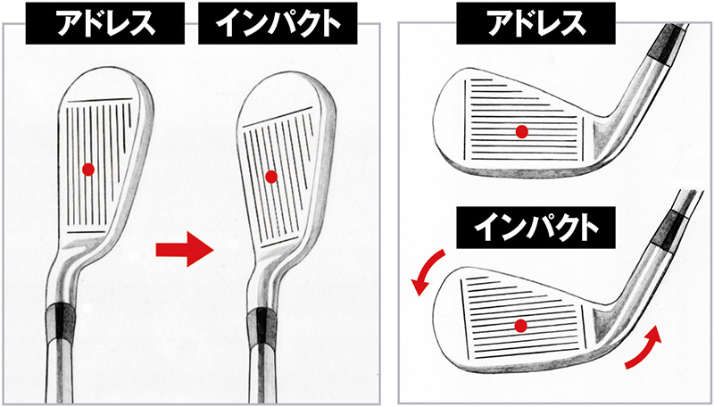 シャフトがタテにしなる、いわゆる“トゥダウン現象”がインパクトエリアで起こる。結果、トゥは下がるが、重心深度が深いほどフェース面は左上向きに変化しやすくなる。