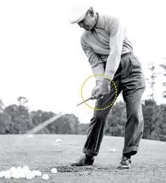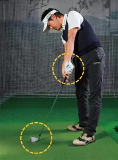 遠心力を生かしてヘッドを走らせる意識を持つほど、アドレス時より手元が浮きやすくなる。