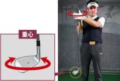 両手でグリップをはさみ、ぶら下がるヘッドをクルクル回してみる。すると回転軸はシャフト軸ではなくヘッド重心であり、トゥ上部とヒール下部が入れ替わるように回ることがわかる。