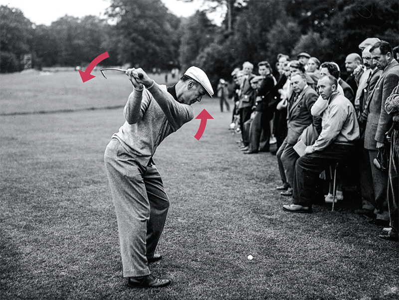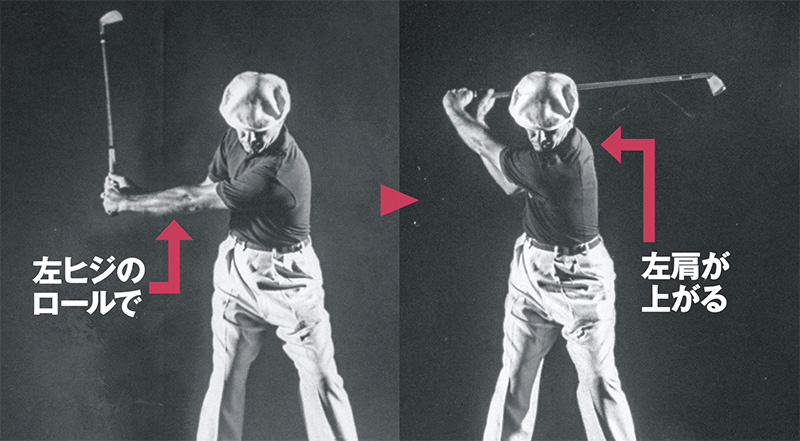 ホーガン自身は〝両手はバックスイングで腰の高さまで近づくと、プレーンと平行に動く〟と『モダン・ゴルフ』で述べています。実際には、肩のターンでテークバックし、両手が腰の高さまで移動した時点から右ヒジをたたみ、左ヒジをロールさせて振り上げていく動きだと思います」(森)
