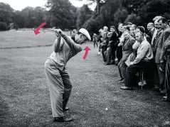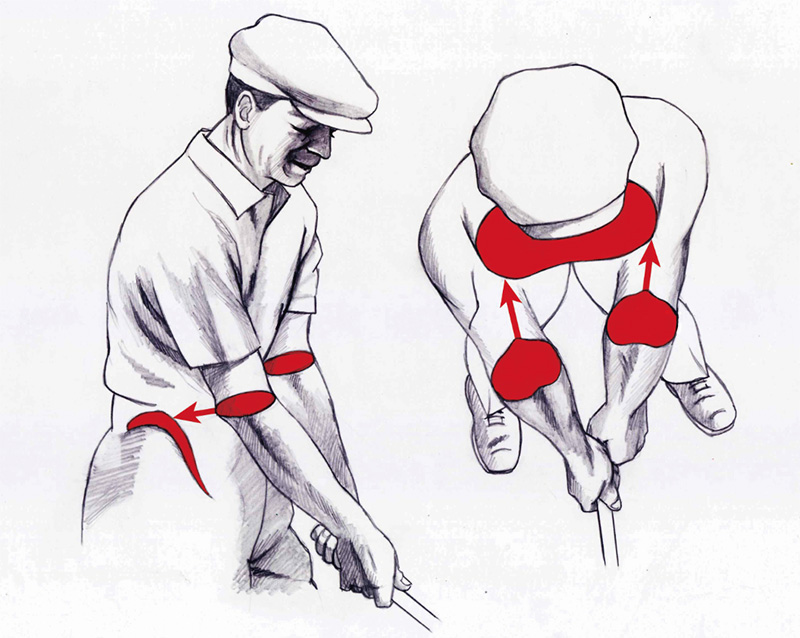 だが、強く締めすぎるとスムーズなスイングを阻害してしまう。ホーガンは両ヒジをそれぞれ腰骨に向けるように内側に回すイメージで、適度な締まり感を生み出した。