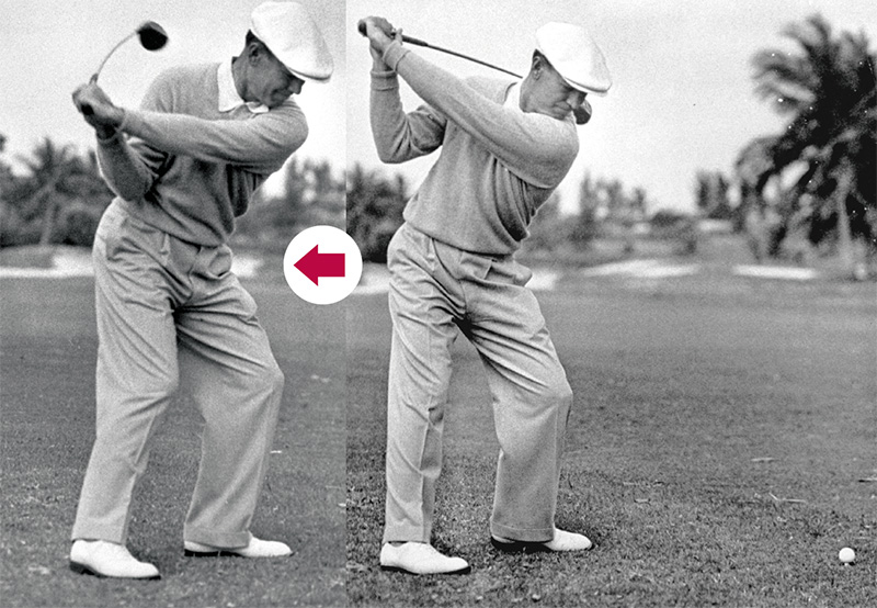 「左腰のターンでダウンを開始すると自動的に右肩が下がってプレーンが変わる、とホーガンは述べていますが、これはインから叩きたい前提があるホーガンだけのイメージ。それも、手元の動きだけです」(森)