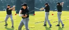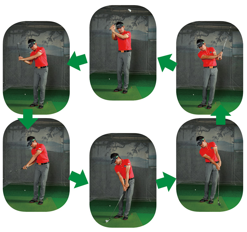 体のターンは抑えて、右ヒジを支点にクラブをグルグル振り回してみる。フェースを寝かせるつもりでシャフトを後方に倒してダウン、フェースを立ててインパクトするつもりでフォローを取ると、スムーズに回るようになる。胸の向きに対して、インサイドアウトの軌道が描けるのが正解。