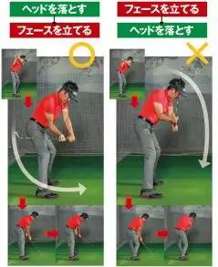 「切り返しから球をつかまえよう、フェースを立てようと手元を意識すると、ダウンでシャフトが立って、ヘッドがアウトサイドから下りるカット軌道になりがちです。