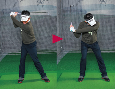 「でも、クラブの重さ(慣性)をうまく生かしたほうが、リピータブルになりやすいはず。右ヒジをたたまずに引けばアーク(弧)が大きくなって肩を深く回しやすいし、右ヒジをたためばアークが小さくなり、クラブによる負荷が減って軸ブレしにくくなります。