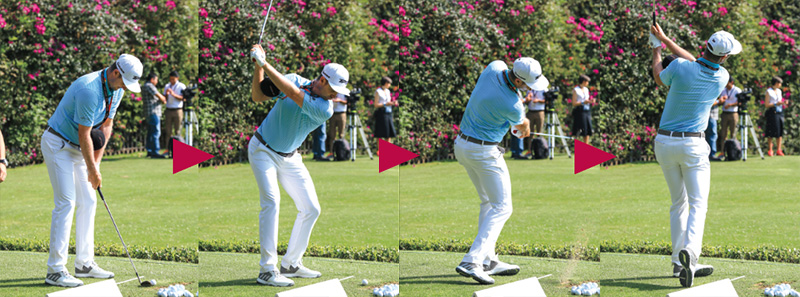 手元が腰の高さに来たポジションから、右ヒジをたたみ、腰も右にターン。左腕のロールでクラブヘッドと手元は右肩の高さに平面を描いて上がっていく。この動きがスムーズなほど、反復性が高まりトップが一定になる。