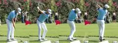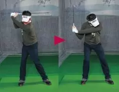 ダウンを左腰のターンでスタートするのがホーガン流。だが、手元の高さがそのままでは、プレーンを外れて前に出るのが必然。