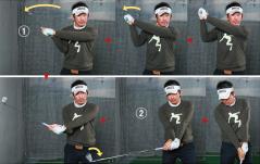 切り返しのスタートで、右ヒジを下げながらこの動作を入れると、ヘッドは背中側に回り込みながら、フェースのタテ回転を開始。体のターンと左腕のたぐり込み動作に合う〝助走〟ができ、理想的なインパクトエリアの動きが得られるという。