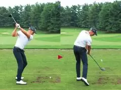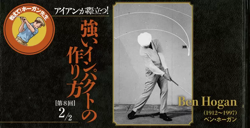 ② 手元が腰の高さに来たポジションでは、ヘッドにはリリースの加速とフェースのタテ回転がすでに始まっているので、後はホーガンが唱える「両手で叩くだけ」で、理想的なインパクトを迎えられる。