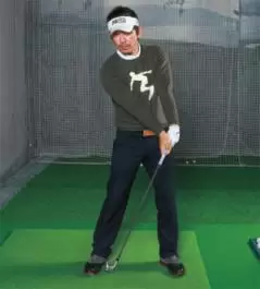 切り返しのスタートで、右ヒジを下げながらこの動作を入れると、ヘッドは背中側に回り込みながら、フェースのタテ回転を開始。体のターンと左腕のたぐり込み動作に合う〝助走〟ができ、理想的なインパクトエリアの動きが得られるという。